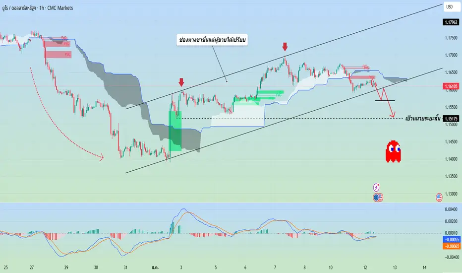 คู่เงิน EUR/USD กำลังสูญเสียแรงส่ง หลังจากถูกปฏิเสธซ้ำหลายครั้งที่ขอบบนของช่องราคา ขณะที่ MACD ส่งสัญญาณตัดลง และราคาหลุดลงมาต่ำกว่าเมฆ Ichimoku