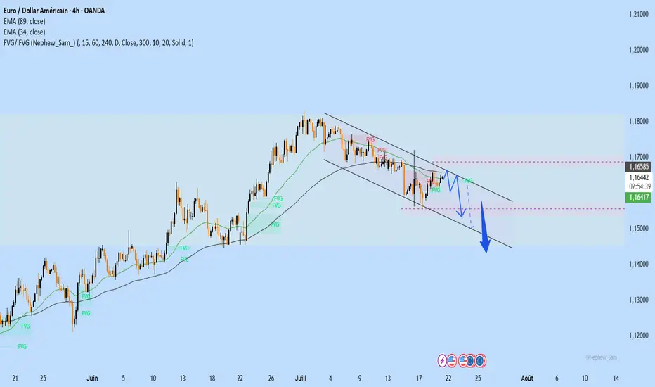 L’EURUSD évolue dans un canal baissier parfait en H4 – avec une série de sommets et de creux de plus en plus bas. Les prix se heurtent systématiquement aux moyennes mobiles EMA34 et EMA89, confirmant la pression vendeuse. La zone FVG autour de 1.16600 agit comme une résistance majeure où un retournement est probable.