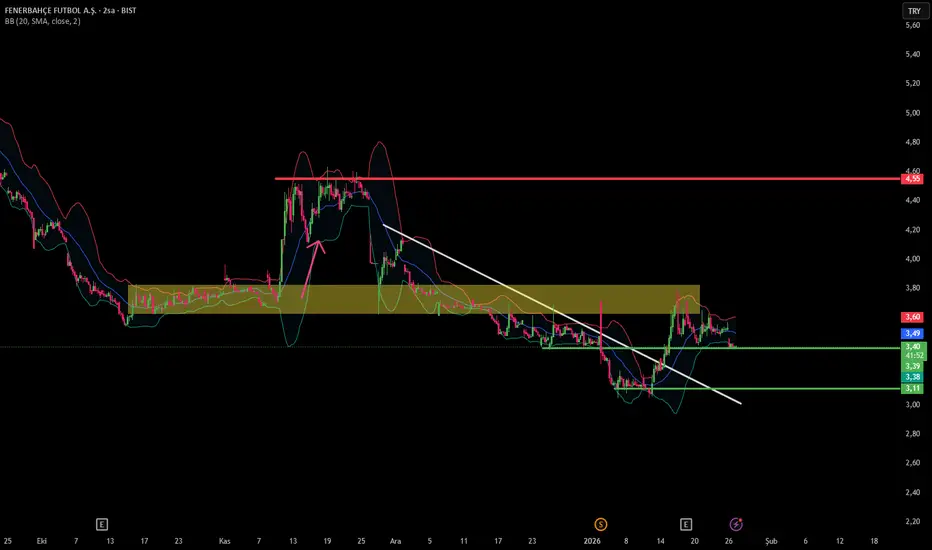 Fenerbahçe hissesi, son beraberliğin ardından düşüşe geçti ve şu anda onay bölgesinin altında hareket ediyor. Eğer 3.41 desteği aşağı yönlü kırılırsa, hissede düşüşün 3.11 seviyelerine kadar sürmesi teknik olarak mümkün görünüyor.