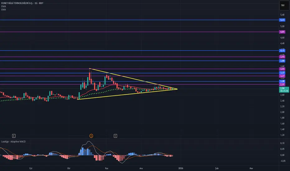 Grafikte Üçgen formasyonu olmakla beraber hedefler fibonacciye göre çizilmiştir.Formasyon şartı olarak sarı çizgi üzeri kapanışlar arayalım.