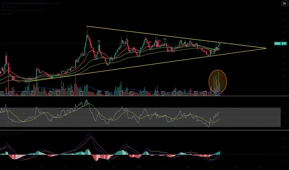 FRIGO 2022den beri oluşan flamayı kırmaya çalışacaktır. Hacminde de muazzam bir artış var (grafikte sarı çemberle gösterdim). Şahsen bu büyük hacim artışı flamayı kıracağına dair inancımı arttırıyor. Yatırım tavsiyesi değildir.