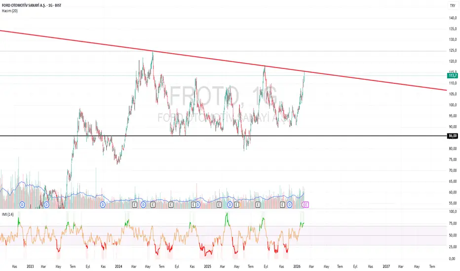 FROTO süzülerek üçgen yapıyor. kırmızı çizgi, direnç çizgisi. geçerse 118 TL ye kadar gidip üçgen kırılımıyla birlikte çanak tamamlama yapması ardından da 115-116 TL seviyesinde onayını tamamlaması mükemmel olur.