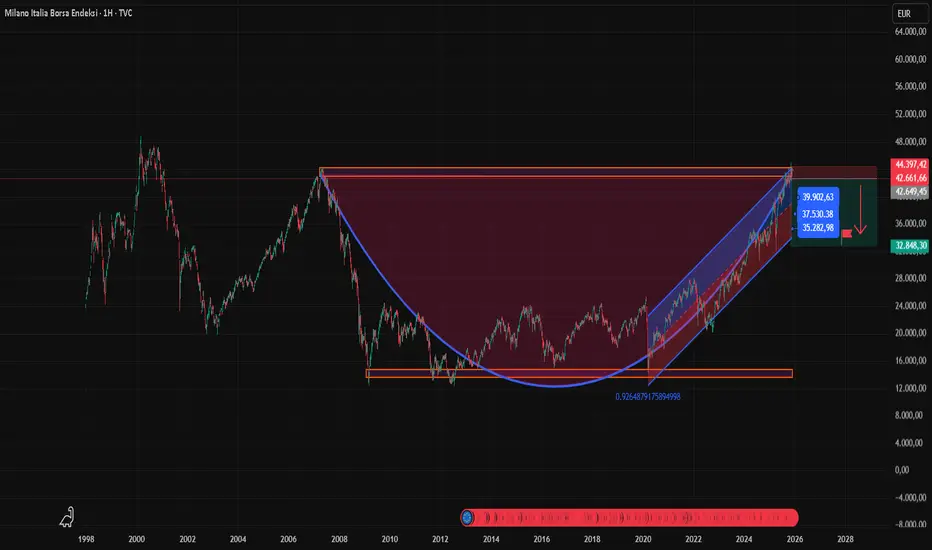FTMIB Endeksi 45,000 seviyelerinden geri çekilmelerin başladığını ve satışların kademeli olarak geldiğini yaklaşık üç haftadır yatay düşüşler gerçekleştirdiğini görüyoruz teknik indikatörlerin short için zamanın yaklaştığını gösteriyor. Avrupa borsalarına baktığımızda DAX dahil olmak üzere FTMIB borsasında da formasyon çanak hedefini 45000 puandan tamamladığını ve kademeli satışların başladığını önümüzdeki haftalarda daha sert satış dalgalarının Milano Borsası FTMIB içinde geçerli olduğunu DAX ile farklı formasyonlar izlese de düşüş trendinin başladığını söyleye biliriz. Ancak Paris borsası CAC40 (px1) için aynı şeyi söylemek mümkün değil CAC40 borsasının DAX (almanya) FTMIB (italya) borsalarından pozitif ayrıştığını aylık yükseliş trendine devam ettiğini ancak FTMIB için önümüzdeki haftalarda DAX ile aynı short posizyonlara uygun olduğu kanaatindeyim. Sıralı hedefler grafikte belirtilmiştir.