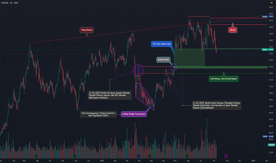 Quantitative Finance'nin belki de öğrenmesi en kolay ve çalışma oranı en yüksek parametrelerinden biri olan "Kırılan Destek/Direnç, Tersine Çalışır" ın güzel bir örneği, gözümüze ilk çarpan detay. 27.03.2025 tarihli mum muhtemelen Analizimizin bel kemiği. Bu mum, Bize çok net bir ret yani Direnç Bölgesi oluşturdu. Daha sonrasında bu bölgeyi ziyaret eden GARAN, Direnç bölgesinden çıkarak Direncimizi "Onayladı". İkinci Direnç ziyaretinde ise Gapli bir şekilde %9'a yakın bir yükselişle Direnç kırıldı. Şuan bu bölgenin Destek olarak çalışacağını "Öngörmekteyiz". Destek olarak hiç ziyaret edilmeyen bu bölgenin hemen üstünde %9'a yakın yükselen mumun oluşturduğu bir FVG (Fair Value Gap) var. Şuan 3. Destek testinde bulunduğumuz GARAN için durumlar güzel gözüküyor. Bu Yükseliş Trendinin başlangıcı olan "Falling Wedge Formasyonu" bizim trendimizin yapısını güçlendiren bir detay. Özellikle de günlük grafikteki "Reversal" Formasyonları çok önemlidir. Trendin kuvvetini arttıran bu detay zaten bize zirvesini gösterdi.