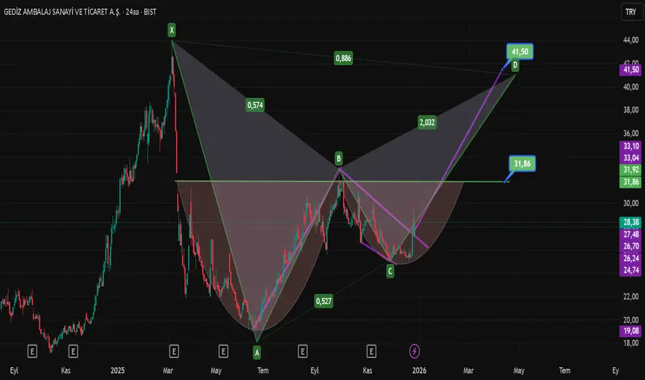 Kullanmış olduğum Harmonic Patterns with Potential Detection indikatörünün #GEDZA hissesinde tespit ettiği Potansiyel Bat Harmoniğinin D noktası hedefi 41₺'dir. Bunun dışında Flama oluşmuş yukarı kırılım ve retesti gelmiş onun hedefi de 41,50₺'dir. Böylece Flama hedefi ile potansiyel Bat D hedefi hemen hemen aynı yeri göstermektedir. Ayrıca grafikte fincan kulp formasyonunun kulp kısmı oluşum aşamasındadır. Fincan-Kulp tamamlanırsa onun hedefi de önceki verdiğim hedefi desteklemektedir. Kulp kısmının oluşması ve 31,86 direncinin kırılması ile işleme girmek daha sağlıklı olacaktır. Kırılımdan sonra hedefe ulaşması ile %30 luk bir artış gerçekleşmiş olur.
