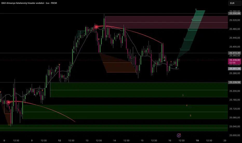 #DAX endeksi tepe bölgesinde karşılaştığı satış baskısı sonrası dalgalı bir fiyatlama içerisinde denge arayışını sürdürüyor. 25.480–25.550 bandı güçlü bir arz alanı olarak çalışırken bu bölgeden gelen reddedilme sonrası fiyat 25.300 seviyelerine kadar geri çekildi. Mevcut yapı, ana yükseliş trendi içerisinde yapılan yatay–düzeltme karakteri taşımakta olup momentumun zayıf seyrettiği görülüyor. 25.370 seviyesi kısa vadeli direnç konumunda; bu seviye altında kalındığı sürece yukarı yönlü denemeler sınırlı kalabilir. Aşağı yönde 25.240 seviyesi ilk destek olarak izlenirken, bu bölge altında 25.120 ve 25.040 seviyeleri ana talep alanları olarak öne çıkıyor. Fiyatın yeniden güç kazanabilmesi için üst direnç bandının aşılması ve bu bölge üzerinde kalıcılık sağlanması gerekiyor. Aksi durumda mevcut fiyatlamanın yatay–aşağı yönlü düzeltme şeklinde devam etmesi olası görünüyor.