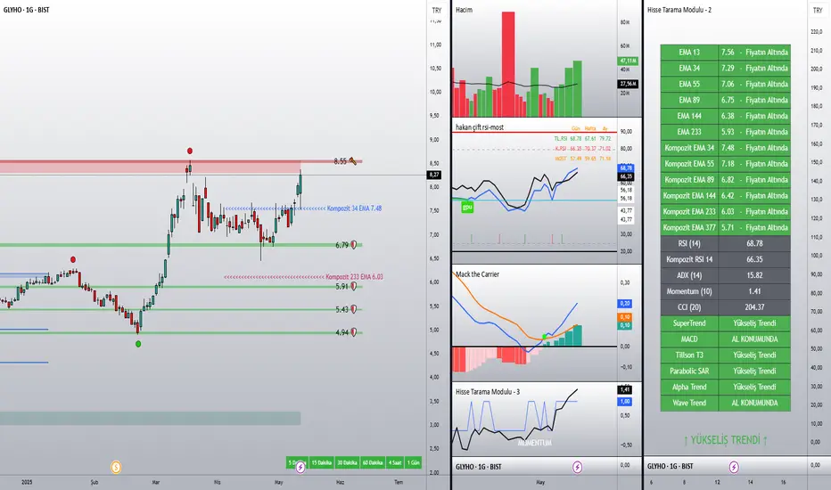 GLYHO bilançosu güzel gelen şirketlerden. 8,55 de direnci var burayı geçerse devam eder. Ema 233 değerimiz 7,48 Tl altında 1 günlük kapanışlarda stop olmak gerek.