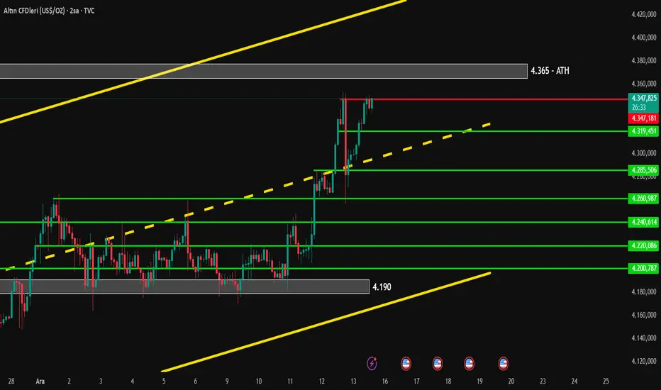 Mevcut durumda fiyat, 4.350 seviyesini tekrar test ederek bu direnci kırmaya çalışıyor. Bu seviyenin yukarı yönlü aşılması halinde, fiyatın eski rekor seviyelerine yaklaşmak amacıyla 4.365 direnç bölgesine doğru yükselmesi beklenebilir. Buna karşılık, 4.350 seviyesinden yeniden bir satış tepkisi gelmesi durumunda fiyatın daha güçlü destek arayışıyla aşağı yönlü hareket etmesi ve ilk etapta 4.320 destek seviyesini test etmesi olası görünüyor. Bu seviyenin de kaybedilmesi halinde, geri çekilmenin kanalın orta çizgisine kadar derinleşebileceği değerlendiriliyor.