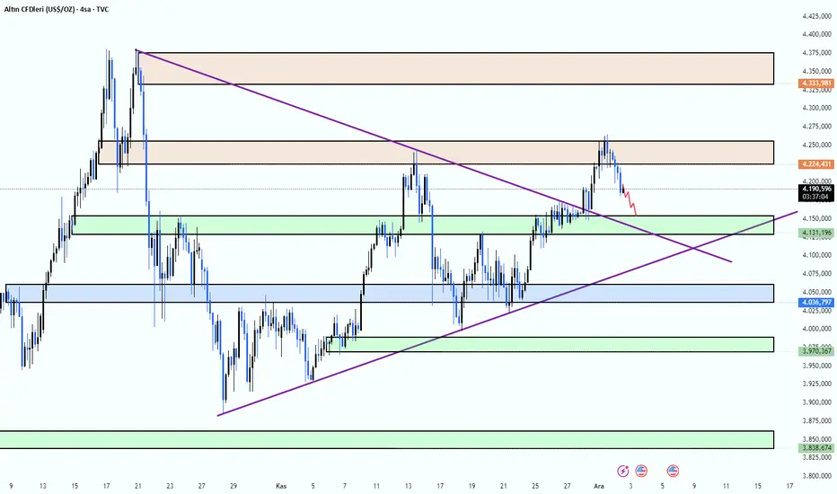 📉 Ancak fiyat 4.131,196 destek seviyesinin altında bir kapanış yaparsa,