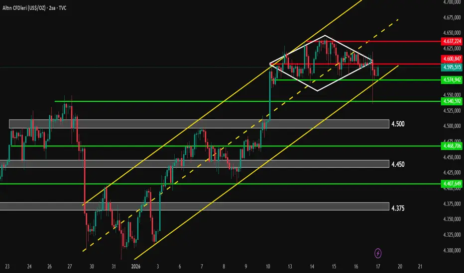 Gold için 2 saatlik grafikte yaptığım analize göre fiyat, yükseliş paralel kanalı içinde hareketini sürdürmektedir ancak kritik bir karar bölgesinde yer almaktadır. 4.500 direncinin aşılmasıyla birlikte fiyat güçlü bir yükselişle kanalın üst bandına ulaşmıştır. 4.575 ile 4.640 seviyeleri arasındaki yatay hareket sonucunda elmas formasyonu oluşmuş, bu formasyondan çıkış sonrası fiyat 4.600 seviyelerinden gelen satış baskısıyla kanalın alt bandına doğru geri çekilerek 4.540 seviyesine kadar gerilemiştir.