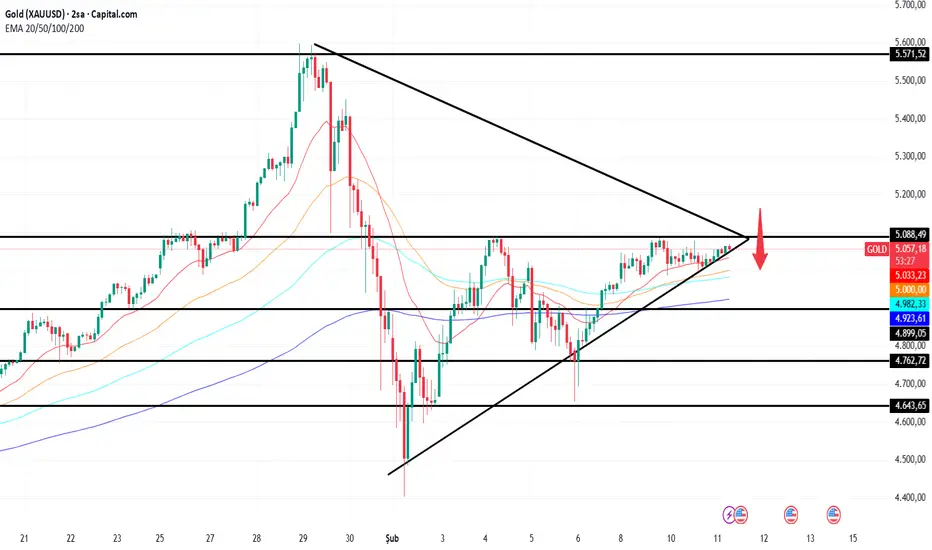 XAUUSD 2 saatlik grafikte simetrik üçgen formasyonu içinde sıkışıyor. Üst trend çizgisinden gelen satış baskısı dikkat çekiyor. Üçgenin aşağı yönlü kırılması durumunda düşüş hızlanabilir. Ayrıca 5.080–5.090 bölgesinde oluşan yapı olası bir çift tepe formasyonuna işaret ediyor. 5.000 seviyesi kritik boyun çizgisi konumunda; bu bölge altında kapanışlar satışları derinleştirebilir. Destekler 5.000, 4.923 ve 4.762; dirençler 5.088 ve 5.200. Fiyat EMA 20 ve 50 çevresinde sıkışmış durumda. Bu ortalamalar altında kalıcılık sağlanırsa teknik görünüm negatife döner. Kırılım yönü teyit edilmeden işlem risklidir.