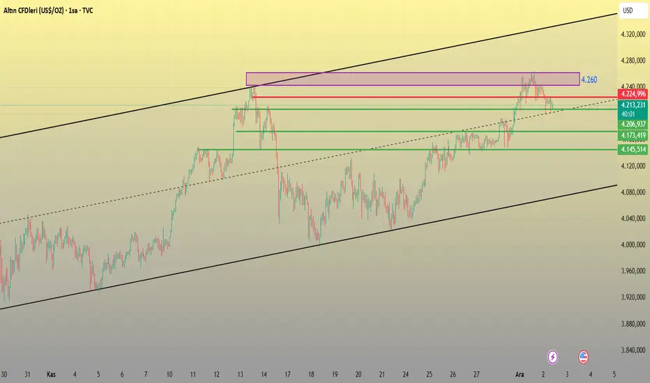 Fiyat, paralel kanal içinde hem destek hem de direnç bölgelerine net tepkiler vererek hareketini sürdürüyor. Mor bölgeden gelen sert reddediş sonrası fiyat, 4.225 seviyesini aşamayınca yeniden aşağı yönlü düzeltmeye geçti ve 4.200 desteğinde tutunma denemeleri başladı.