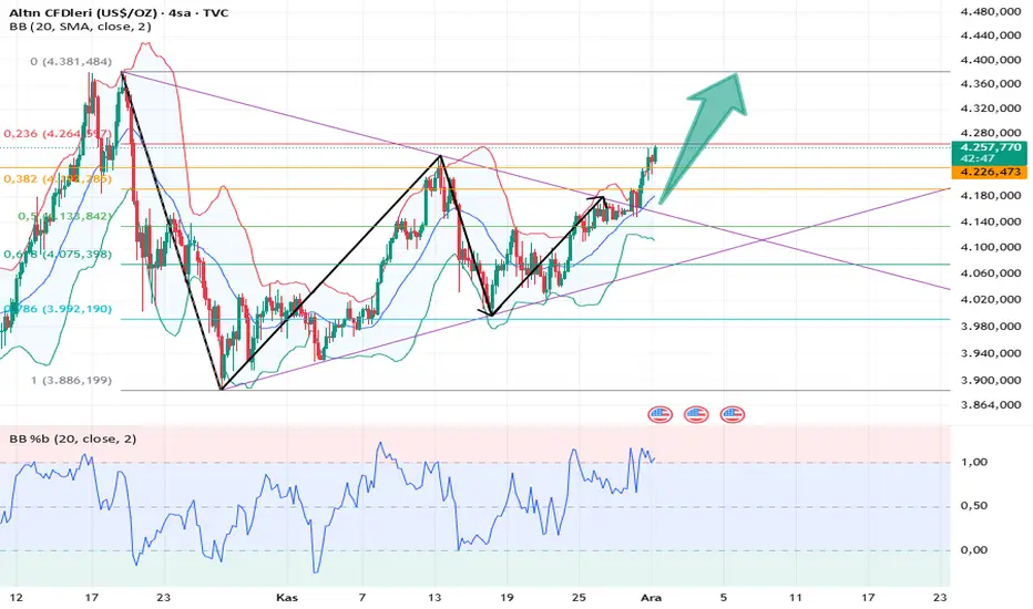 1 saatlik grafiğe bakıldığında, altın Avrupa seansı boyunca yükseliş trendini sürdürdü. Mum formasyonu yükselen bir kanal içinde ve kısa vadeli Bollinger Bantları yukarı doğru daralıyor. Gösterge düzeltmesinin ardından olası yatay konsolidasyon ve ardından toparlanma ihtimaline dikkat edin. Direnç 4260 civarında görülüyor; bu seviyenin üzerine çıkılması 4300/4330 seviyelerine doğru daha fazla yükselişe yol açabilir. Destek seviyeleri ise 4230/4222 civarında.