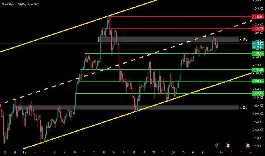 Şu anda fiyat, 4.190 bölgesini yeniden kırmak için test ediyor. Bu seviyenin aşılması durumunda yükseliş ivme kazanır ve fiyat kanalın üst bandını geçerek yaklaşık 4.210 seviyesine kadar yükselebilir. Ancak 4.190 bölgesinden bir ret gelirse trend yeniden düşüşe döner ve daha güçlü bir destek ihtiyacı doğar. İlk olarak 4.150 seviyesi tepki verebilir; bu seviyenin kaybolması durumunda düşüş derinleşir ve fiyat 4.110 seviyesine kadar gerileyebilir.