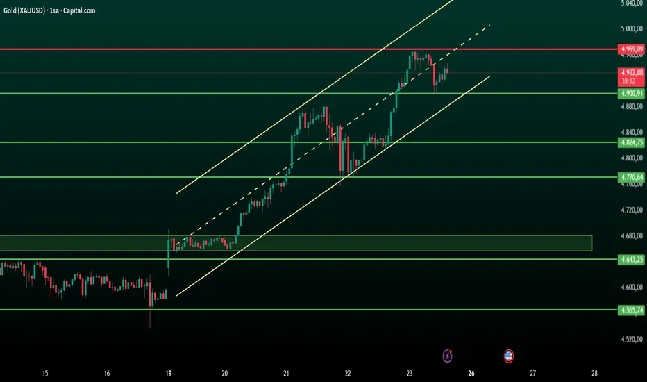 Altın, yukarı yönlü hareketini destekleyen önemli bir yükseliş kanalı içinde işlem görmekte. Bu kanalın üst sınırına yaklaşan fiyat, eğer bu seviyeyi aşarsa 4.969,09 seviyesine doğru yeni bir hedef belirleyebilir. Kanalın alt sınırından destek alarak yapılan çıkışlar, bu yükselişin sürdürülebilir olduğunu gösteriyor.