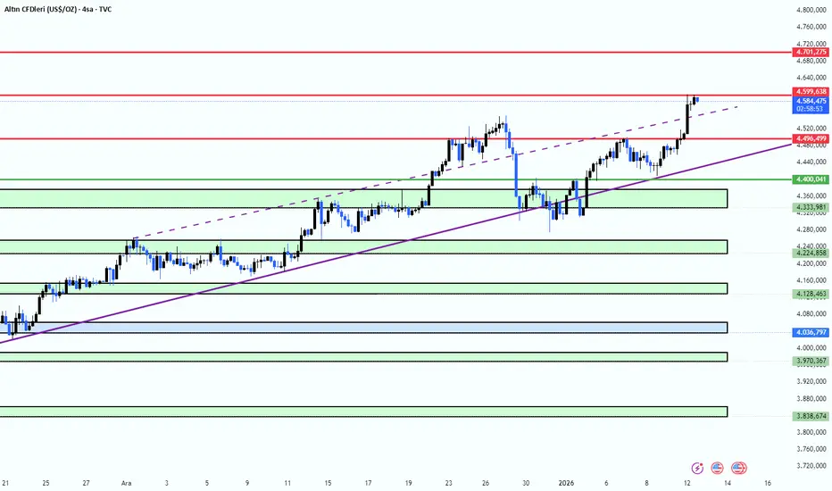 🕹️ Genel görünümde fiyat hareketi pozitif seyrini koruyor. Bu nedenle 4.599,638 direnç bölgesindeki fiyat tepkisi, kısa vadeli yön tayini açısından kritik önem taşıyor.