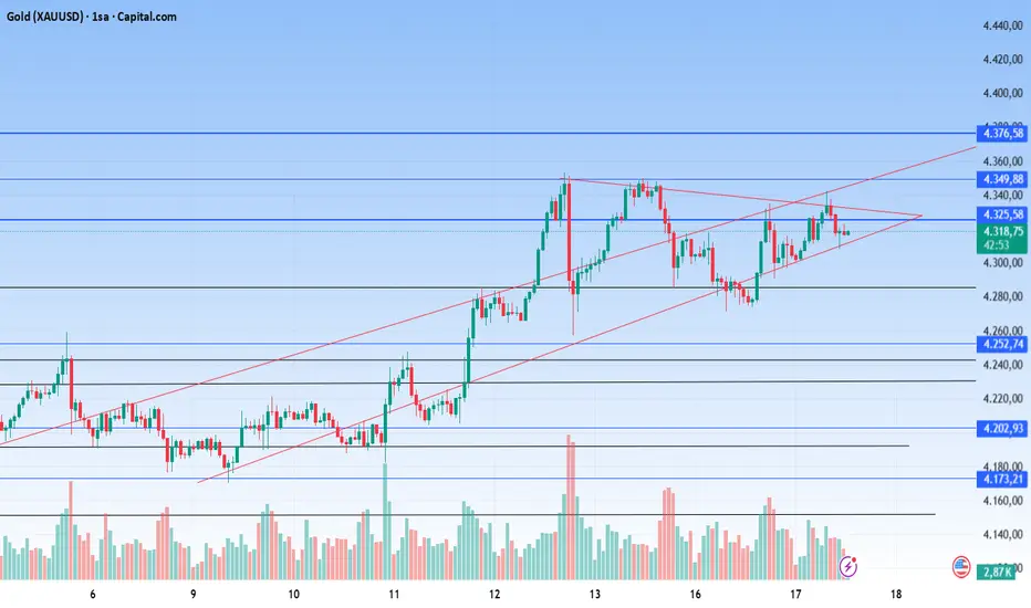 Altın fiyatı yükselen kanal içinde hareketini sürdürüyor. Fiyat, 4.320 – 4.325 bandında sıkışmış durumda ve kısa vadede simetrik üçgen formasyonu dikkat çekiyor. Bu bölge aynı zamanda ara pivot niteliğinde.