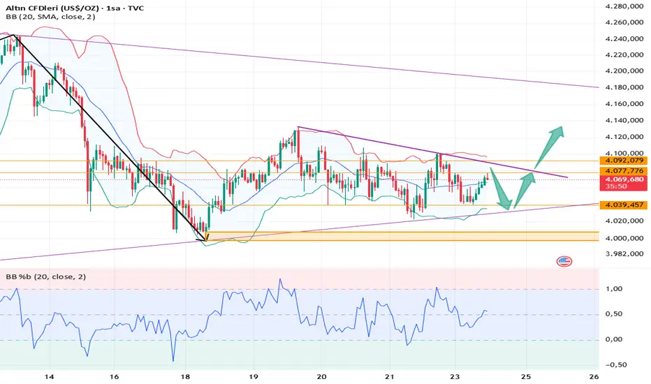 1 saatlik grafiğe bakıldığında, altın Avrupa seansındaki düşüşün ardından toparlandı ve Bollinger Bantları daraldı. ABD seansında odak noktası, 4078 ve 4092 civarındaki direnç seviyeleriyle bu toparlanmanın devamı olacak. Kısa vadeli takip aralığı ise 4040-4100;