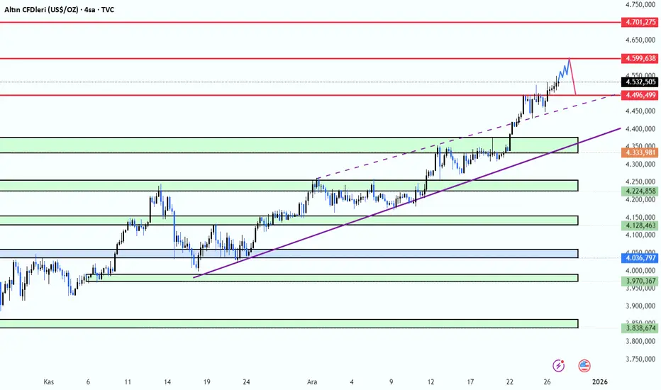 🕹️ Genel görünümde fiyat hareketi pozitif seyrini koruyor. Bu nedenle 4.496,499 destek bölgesindeki fiyat tepkisi, kısa vadeli yön tayini açısından kritik önem taşıyor.