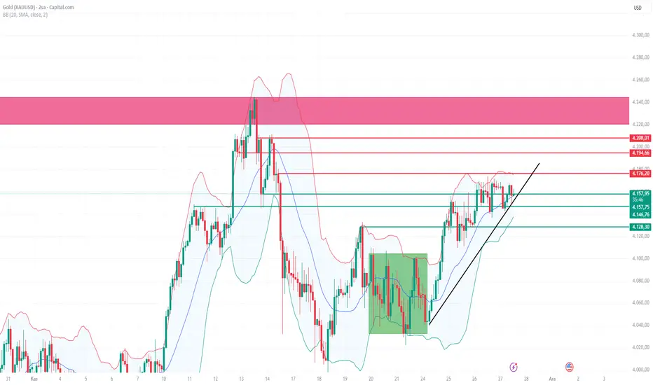GOLD grafiğine baktığımızda, mevcut yükseliş trendinin istikrarlı bir şekilde devam ettiğini görmek mümkündür. Bugün piyasaların görece sakin seyretmesi nedeniyle, gün içinde 10–20 puan aralığında sınırlı hareketler ortaya çıkabilir. Bu çerçevede, GOLD için en yakın direnç noktası olan 4.176 seviyesine kadar yükseliş yaşanması olası görünmektedir.
