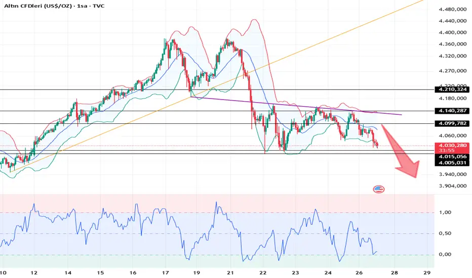 1 saatlik grafik şu anda düşüş bayrağı konsolidasyon formasyonunda. 4000 seviyesinin tekrar test edilmesi, hatta kırılması muhtemel, bu nedenle bugünün stratejisi yüksekten satıp düşükten almak.
