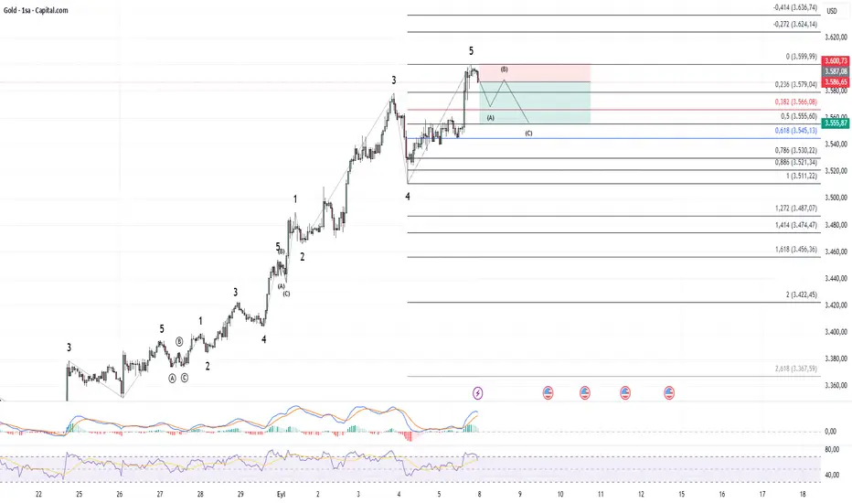 Altında 5 dalgalı yükseliş sonrası klasik bir ABC düzeltme ihtimali yüksek. 3.545 – 3.530 aralığı kritik destek bölgesi. Bu bölgeden gelecek tepki hareketi yeni trendin yönünü belirleyecek.