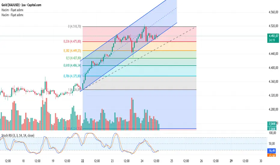 Grafikte görülen Fibonacci seviyeleri de önemlidir. Şu an 0.5 Fibonacci düzeltme seviyesi olan 4,427 civarındaki bölge kritik bir destek olarak çalışabilir . Eğer fiyat bu seviyenin altına düşerse, altın için daha büyük bir düşüş riski doğabilir. Ancak yükselirse, 0.236 Fibonacci seviyesi olan 4,475 ve ardından 0.618 Fibonacci seviyesi olan 4,406 seviyeleri takip edilmesi gereken diğer kritik noktalar .