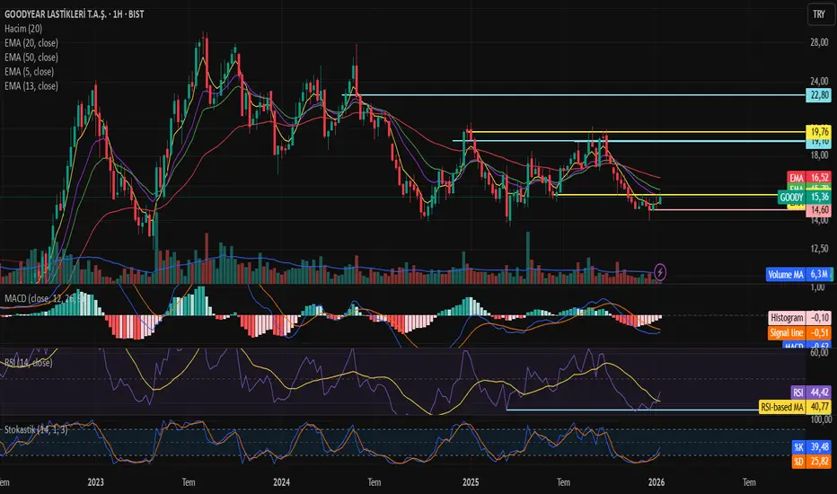 29 Eylül 25 haftası itibarıyla düşüş trendinde olan GOODY hissesinin, 15 hafta sonra ilk kez anlamlı bir hacim artışıyla birlikte EMA5 (sarı) üzerinde kapanış yapması önemli bir gelişme olarak değerlendiriyorum.