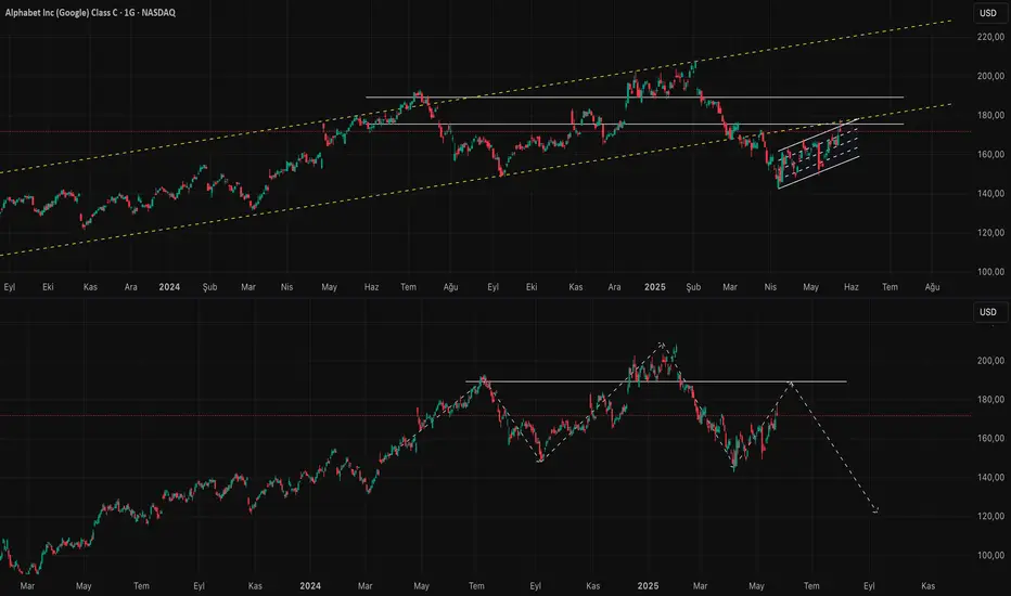 Alphabet (GOOG), uzun vadeli yükselen kanalın alt bandında fiyatlanıyor. Son yükselişle birlikte kısa vadede bir rising wedge (yükselen kama) formasyonu içinde hareket ediyor. Fiyat, aynı zamanda 175–178 dolar bandında yoğunlaşıyor.