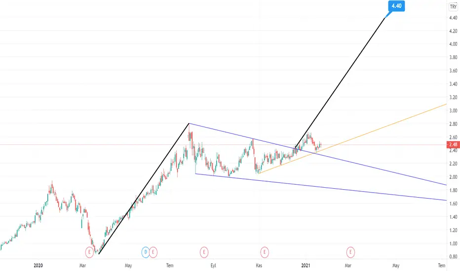 hacimli bir şekilde 2.42 direnç noktasını geçip biraz yükseliş geldikten sonra yükseliş onayını almak için geri dönen GSDHO 4.40 TL hedefine tam gaz ilerlemeye devam edecektir. Ayrıca sarı ile çizdiğim trendde yeni bir destek oluşumu var.