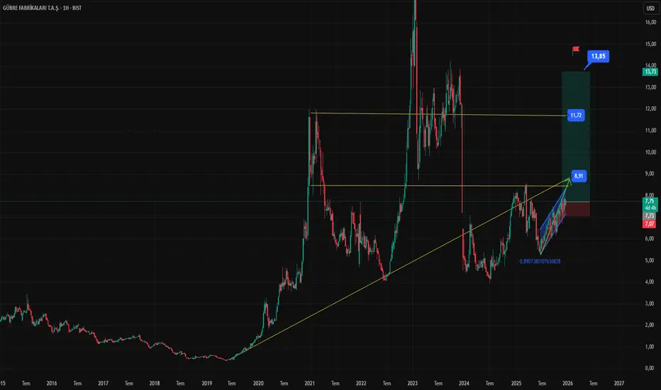 Fiyat performans değerlendirmesi açısından gayet sağlıklı düzeltmeler yaparak yükselişini sürdüren GUBRF hissesi için haftalık görünümün halen pozitif olduğunu söyleye biliriz. USD bazlı grafikte sıralı hedefler belirtilmiştir. 8,90$ üzerinde kalıcılık gerçekleştiği taktirde FİBO 0,618 seviyesinin üzerinde daha sert hareketler gelebilir. Ancak kısa vadeli yatırımcılar için bir yol ayrımının yaklaştığını da söyleye biliriz.