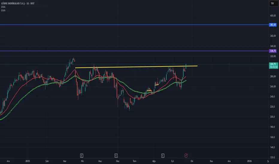 Formasyon şartı olarak sarı çizgi üzeri kapanışlar arayalım.İlk hedef noktası fibo 1,414 seviyesi olan 330,75 ana hedef 382,50.
