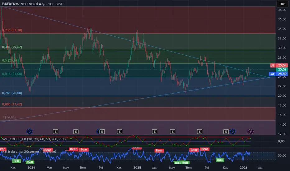 Fiyat şu an 24–27 bandında, üçgenin üst trend çizgisiyle ve 0,5–0,618 fibo bölgesiyle çakışan bölgede sıkışıyor. Uzun vadeli yükselen dip trendi de halen korunuyor.