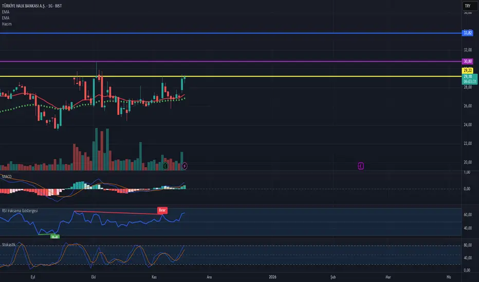Grafikte fincan kulp formasyonu olmakla beraber sarı çizgi üzeri kapanışlar arayalım.İlk hedef çıkışın fibo 1.414 denk gelen 30,80 bu seviyenin üzerinde kapanışlar görmemiz durumunda ana hedef 33,82.