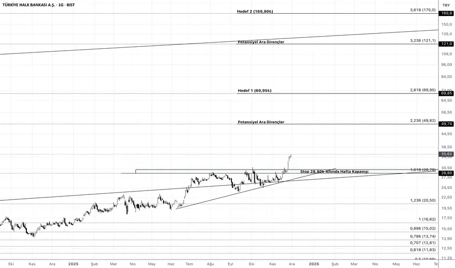 HALKB yıllardır geri kalmışlığın acısını yatırımcısına ve ülkesine hissettirmiş durumda. Fakat artık kamu bankaları ve kamuya bağlı yatırım bankalarının zamanı geldi. Dolar bazında hak ettiği seviyelere ulaşmasını bekliyorum. Fibo dirençleri ve kanal dirençleri yakın çekim bu grafikte çok gözükmese de orta-uzun vadeli olarak banka faizi ve enflasyonun üzerine çıkacağı hareketini başlattı. Yatırımcısına hayırlı olsun.
