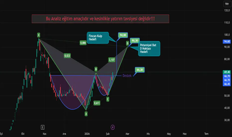Fiyatın D noktasına ulaşması ile Harmonik Bat Formasyonu oluşturması beklenmektedir. Henüz 52₺ civarında tespit edilmiş olup, 66,30 ₺ direncinin kırılması ve Fincan Kulp Formasyonun oluşması bu formasyonun oluşma ihtimalini güçlendirmiştir. Potansiyel Bat Formasyonu olası hedefi 90,30 ₺'dir.