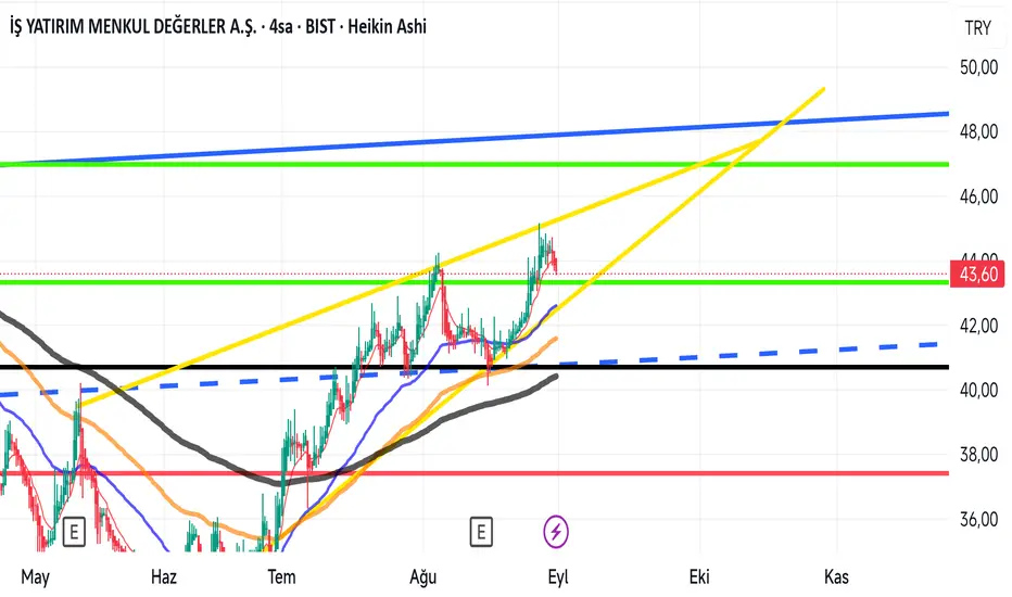 Her zamanki gibi yükselen bir mavi kanalımız var . Geride. İleriye doğru bakarak ismenin orta bandını genelde sancılı geçiyor düzgün bir çıkış ve orda tutuna bilmesi için orta banda destek yapması lazım yapmadığı sürece yeşil direnç 43 ten red yiyp aşağı düşecek bence ilk alış 40 seviyesi olabilir neden diye sorarsan kendine orda küçük bir kase formasyonu tamamlamış ve 3 kez siyah çizginin üstüne retest yapmış (demek oluyor ki ben burdan aşağı düşmek istemiyorum) yani destek . Hayali bir sarı çizgi var orda onu şuan öylesine koydum 😁