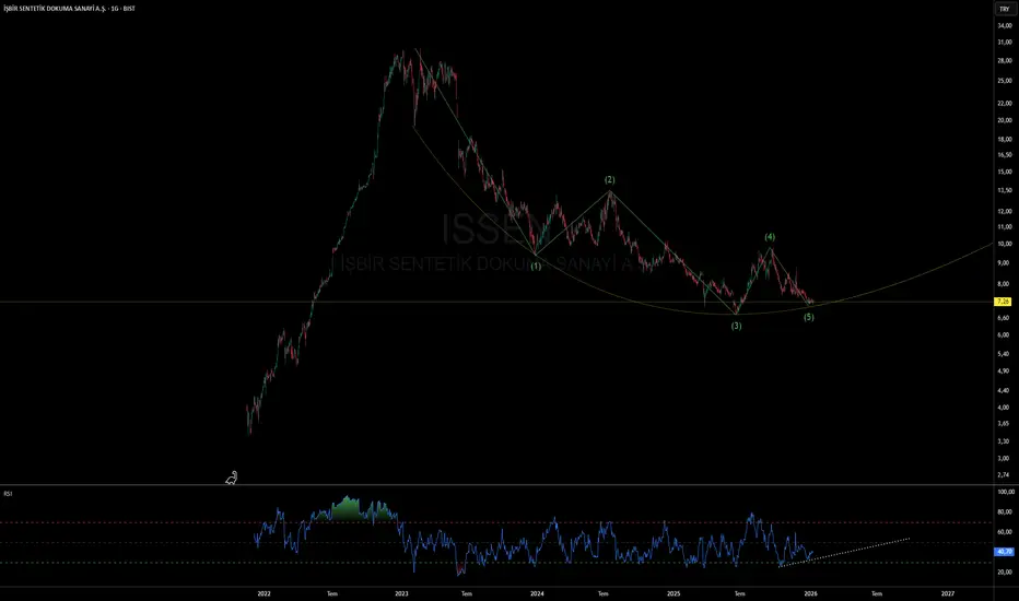 Grafikte 2021–2022 dönemindeki parabolik yükselişin ardından hissede klasik bir majör düzeltme yapısı izleniyor. Tepeden itibaren fiyat davranışı, 5 dalgalı bir düşüş impulsu ile uyumlu.