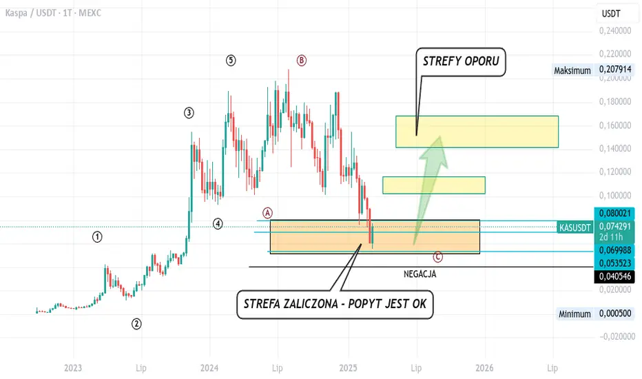 Witam. W ostatniej analizie KASPY zwracałem uwagę na strukturę dystrybucyjna która miała za zadanie wywołać korektę na tym walorze. Ostatnie spadki na BTC bardzo ładnie ściągnęły KAS do strefy popytowej. Po zaliczeniu strefy i 1 poziomu, mamy bardzo fajna reakcje. Mimo iz rynek nie sprzyja aktualnie wzrostom na rynku krypto, to samo miejsce od którego się odbijamy jest istotne. W związku z tym uważam ze można spokojnie szukać sygnału do przyłączenia się do tego rynku.