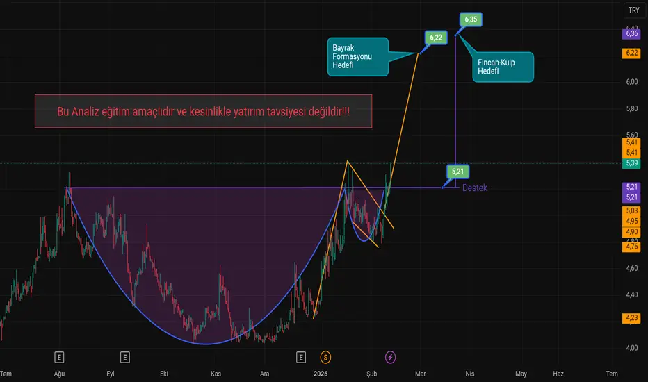 5 ₺ civarında bayrak formasyonu oluşmuştu ve önünde bulunan 5,21 ₺ direncini kırarak, hem 5,21 ₺ seviyesi desteğe dönüştü hem de Fincan Kulp Formasyonu oluştu. Teknik analize göre sırasıyla hedefleri 6,22 ₺ ve 6,35 ₺'dir. Her ikisinin de hedefleri birbirine çok yakındır.