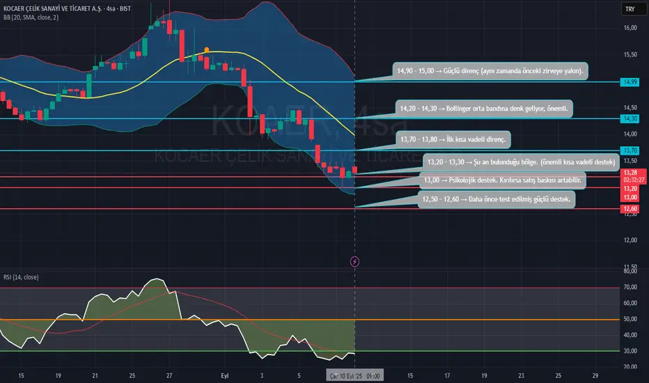 Bollinger Bandı: Alt banda yakın (13,08). Bu genelde "aşırı satım bölgesi" sinyali olabilir, fakat trend aşağı yönlü.