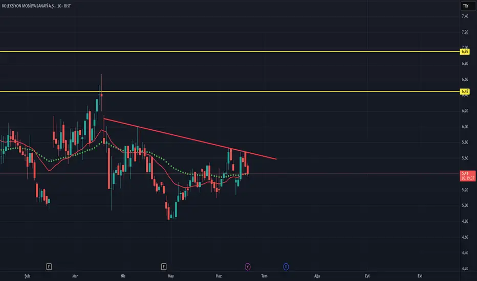 Kırmızı çizgi üzeri kapanışlar görebilirsek ilk hedef çıkışın fibo 1.414 denk gelen 6.45 ana hedef 6.95.