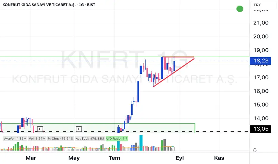 Konfrut güzel bir yükselişin ardından yukarı bölgede consolide oluyor. Üçgen hareketi çiziyor. Hacimli alımlar ve kırılımlara dikkat etmek gerek.