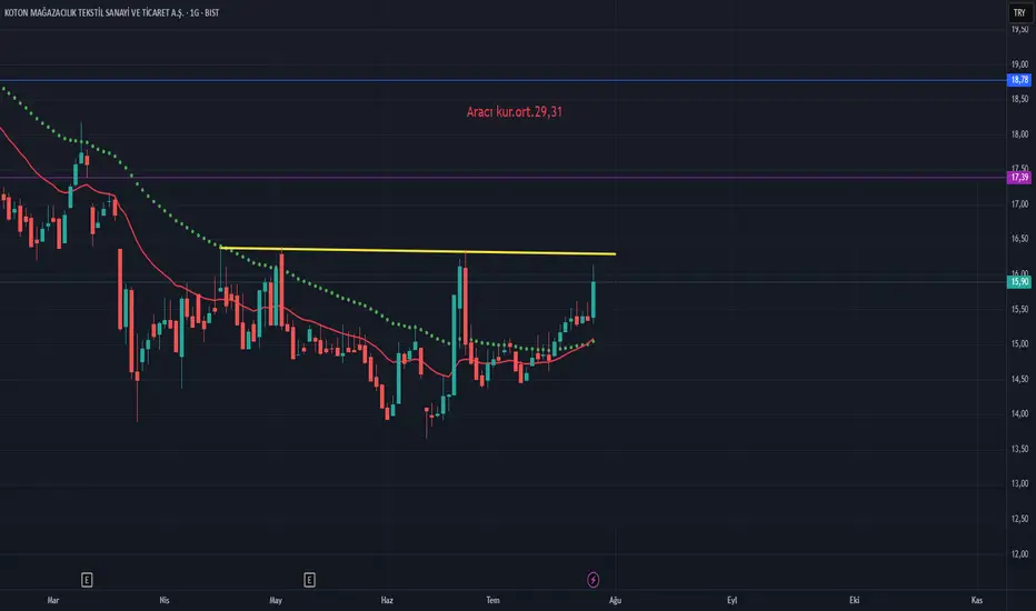 Sarı çizgi üzeri kapanışlar görebilirsek ilk hedef çıkışın fibo 1.414 denk gelen 17.39 ana hedef 18.78.