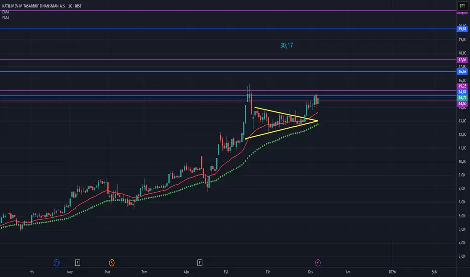 9 Aylık bilanço geldi eder fiyat 30,17.Teknik anlam da grafikte üçgen formasyonu olmakla beraber hedefler fibonacciye göre çizilmiştir.22 ema ve 50 ema üzerinde old.sürece yön yukarı.