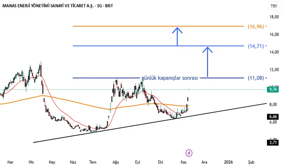 11.08 üzerinde günlük kapanışlar sonrası yükselişin devam edeceğini düşünüyorum. Günlük kapanışlar sonrası ilk radarındaki hedefi 14.70 olacaktır. Kapanışlar güzel gelirse turuncu seviyeyi takip edeceğiz. Hisse şuan tavan gidiyor yeni alımlarda risk seviyemize göre stoplarımıza dikkat edelim.