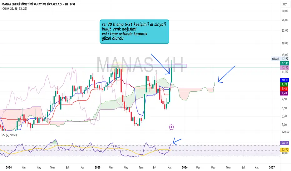 manas hissesinde ema 5-21 yukarı keser ile al sinyali üretmiş olduk bu sinyalide rsı 7 de 70ve ustu deger ile teyit ettik basarılı olacagını düşündüğüm bu sinyal ile ath seviyesi üzerinde bir bar kapanısı yapması ile alım denemesi yapılabilir