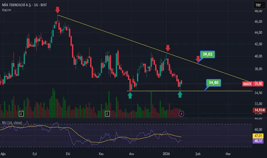 #mıatk günlük grafikte düşen kanal devam etmekte ikili dip formasyon çalışması yaparak yönünü yukarı çevirmiş durumda 39,02 direnç kırıldıgında akrasif yükseliş olacagını düşünüyorum... yatırım tavsiye degildir.