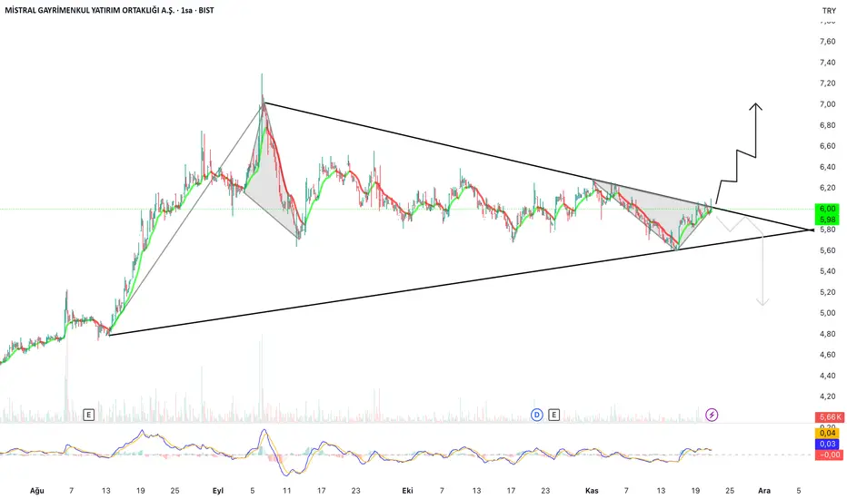 • Tetikleyici: Fiyatın, alçalan direnç çizgisini ve psikolojik direnç olan 6,00 - 6,10 seviyelerini güçlü bir hacimle yukarı yönlü kırması.