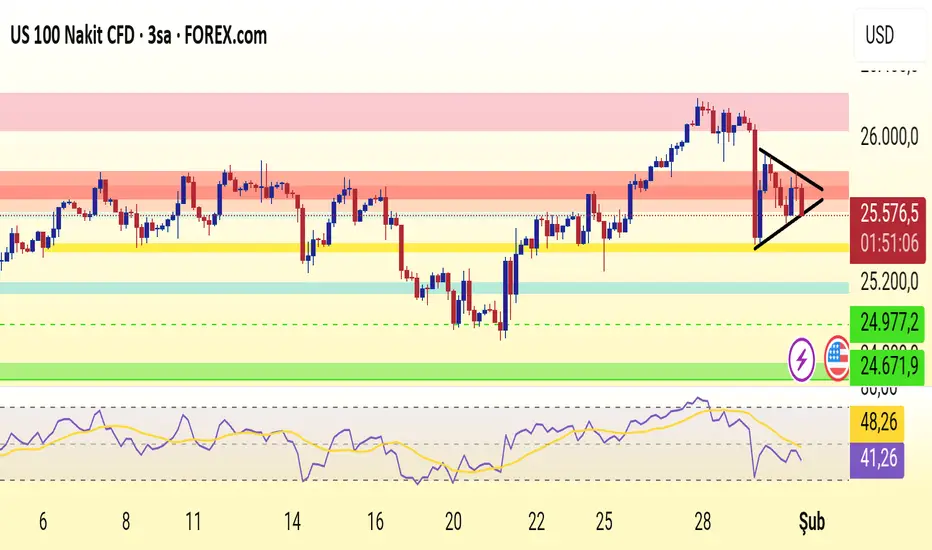 Siyah trend çizgileriyle belirlenen ters flama formasyonu, dikkatle izlenmesi gereken bir yapı sergiliyor. Eğer sarı bölge bir kez daha test edilirse, bu durum 25.200 seviyelerine doğru olası bir geri çekilmenin onayını verebilir.